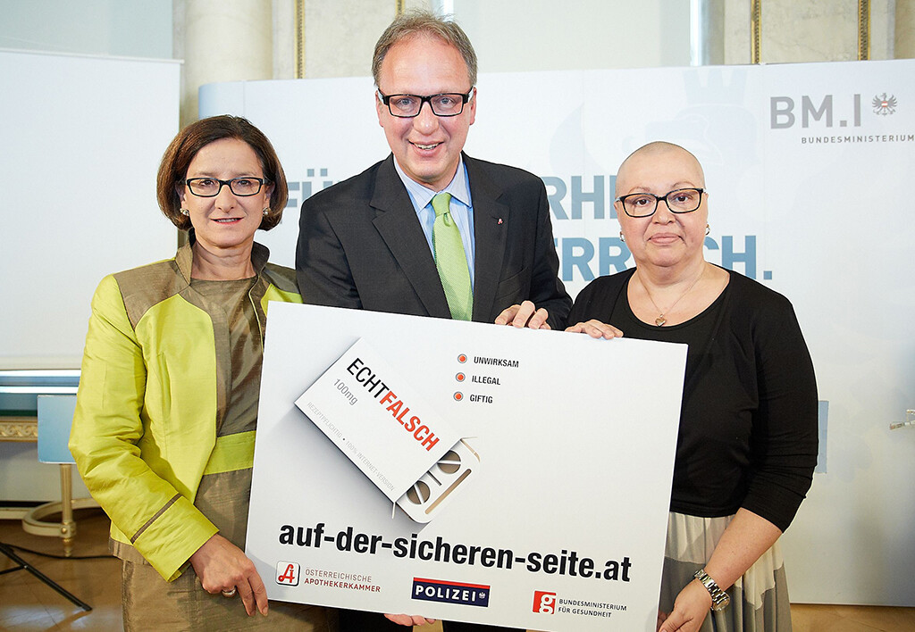 Kampagne zu Arzneimittelfälschungen aus dem Internet. Im Bild v.l.n.r. Innenministerin Mag.a Johanna MIKL-LEITNER, Mag. pharm. Max WELLAN, Präsident der Österreichischen Apothekerkammer und Gesundheitsministerin Dr.in Sabine OBERHAUSER, MAS. © Österreichische Apothekerkammer / APA-Fotoservice / Preiss