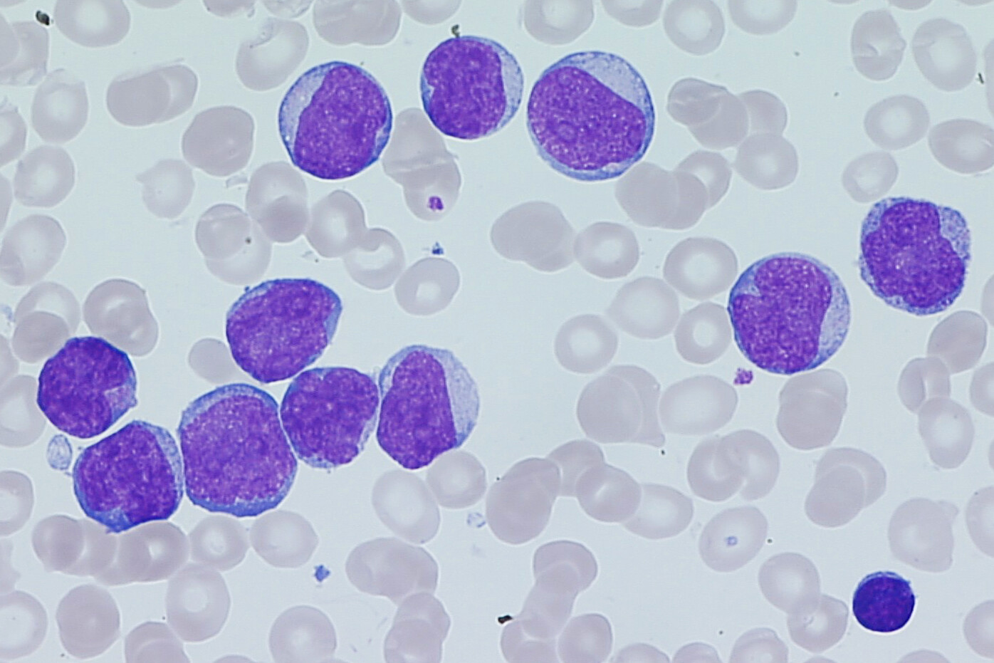 Überschwemmt vom Blutkrebs: Ausstrich einer Knochenmarksprobe; Bei der Akut Myeloischen Leukämie (AML) vermehrt sich ein Vorläufertyp der weißen Blutkörperchen (Myeloblasten, dunkel eingefärbt) übermäßig und verdrängt andere Blutzell-Typen (transparent). Durch die neuartige Therapie wird diese Zell-Vermehrung gestoppt. © Universitätsklinikum Freiburg