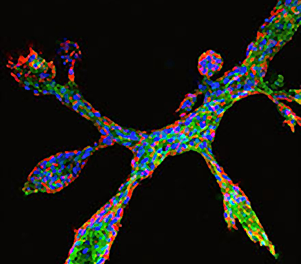Brustdrüse nachgebaut: Detail einer sich verzweigenden Brustepithelstruktur in Kultur. © Haruko Miura / Helmholtz Zentrum München – Deutsches Forschungszentrum für Gesundheit und Umwelt