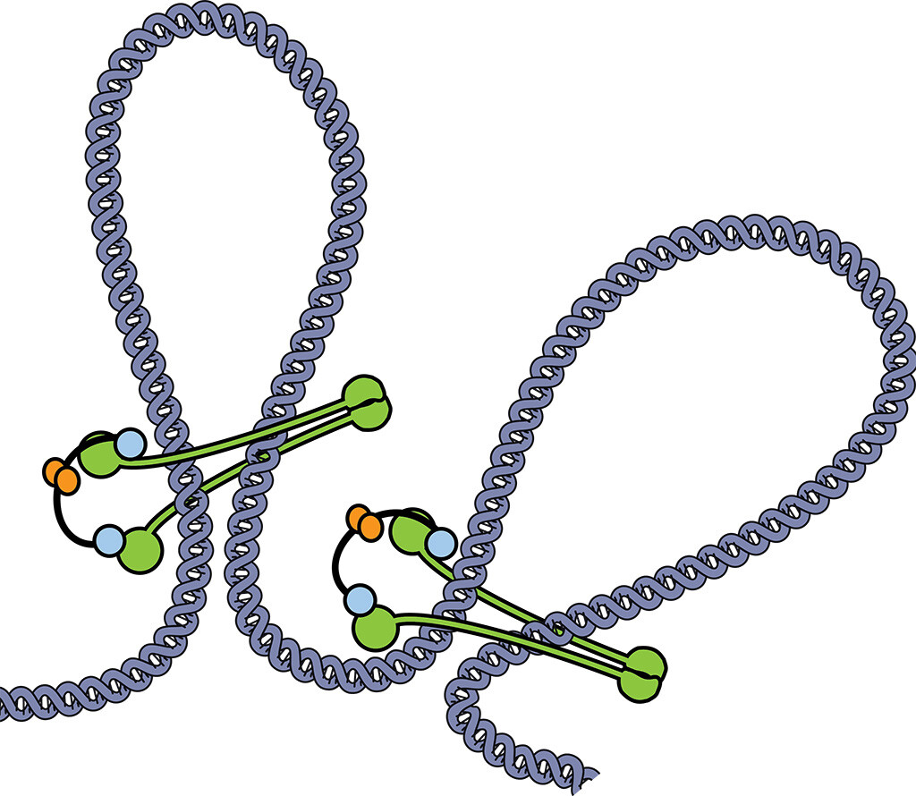 Der SMC-Proteinkomplex (grün, blau, orange) umfasst die DNA (grau) wie eine Klammer und sorgt so für Ordnung. © Larissa Wilhelm / MPI für Biochemie