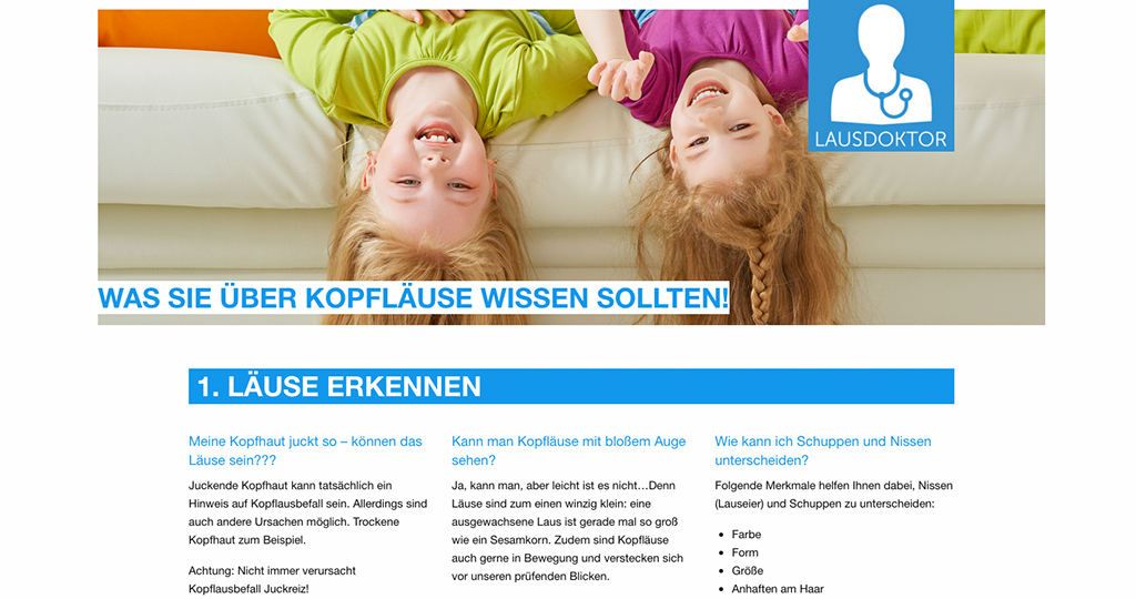 So werden zum Beispiel folgende Fragen auf lausdoktor.at beantwortet: Woher kommen Kopfläuse? Da gibt es nur einen Weg: von einem anderen Kopf! Läuse fallen weder von Bäumen noch werden sie von Haustieren übertragen. Wie lange dauert Kopflausbefall? Ohne Behandlung verlassen Kopfläuse ihren menschlichen Wirt nie, denn sie sind auf unser Blut als Nahrung angewiesen. Mit einem entsprechenden Lausmittel aus der Apotheke können Sie die Läuse aber bereits mit nur einer Anwendung loswerden! Lausbefall! – Muss ich jetzt die Wohnung desinfizieren? Nein. Ohne „Blutsaugen“ überleben Kopfläuse bei Zimmertemperatur nur etwa drei Tage.