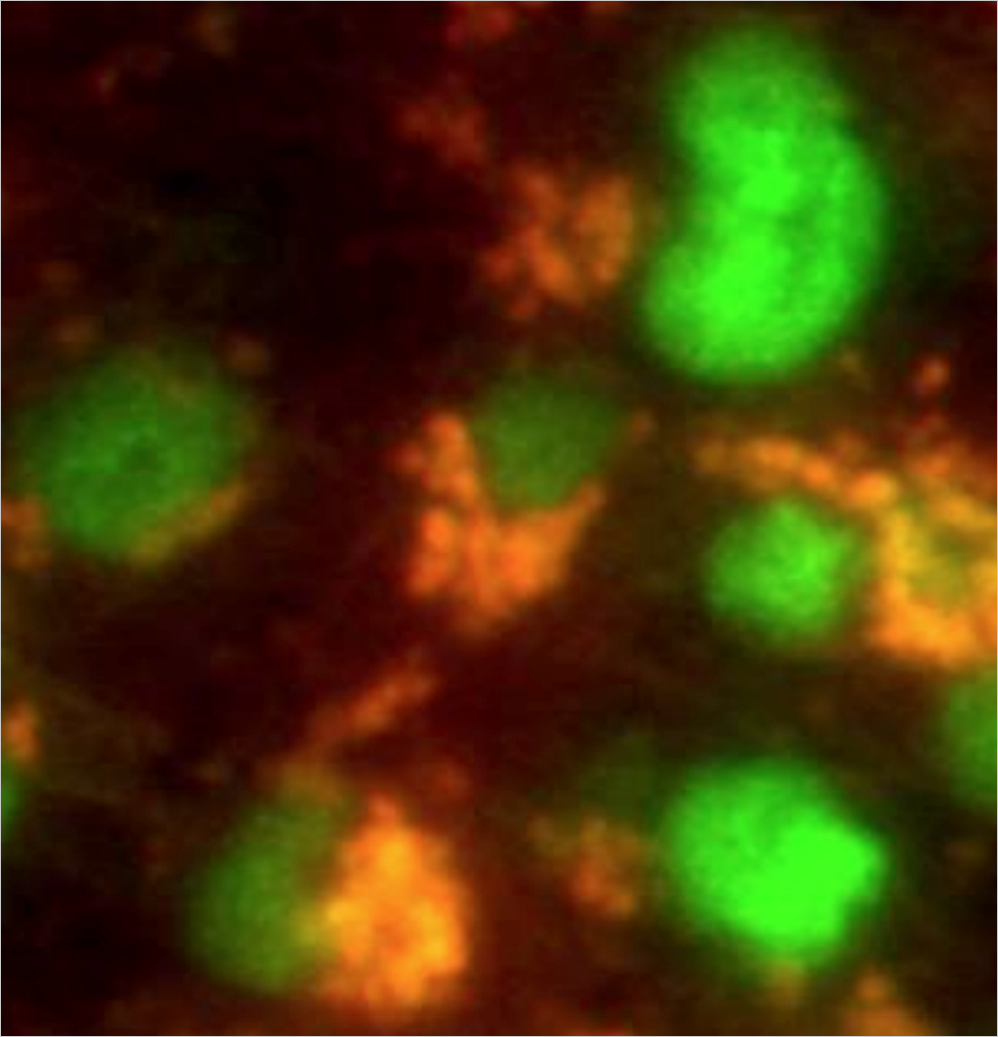 Hirntumor-Stammzellen (orange) in Mäusen exprimieren Stammzellmarker. Wissenschafter der Washington University of Medicine in St. Louis untersuchen wie Tumor-Stammzellen Behandlungsresistenz verleihen bzw. wie man dagegen ankämpft. © Yi-Hsien Chen