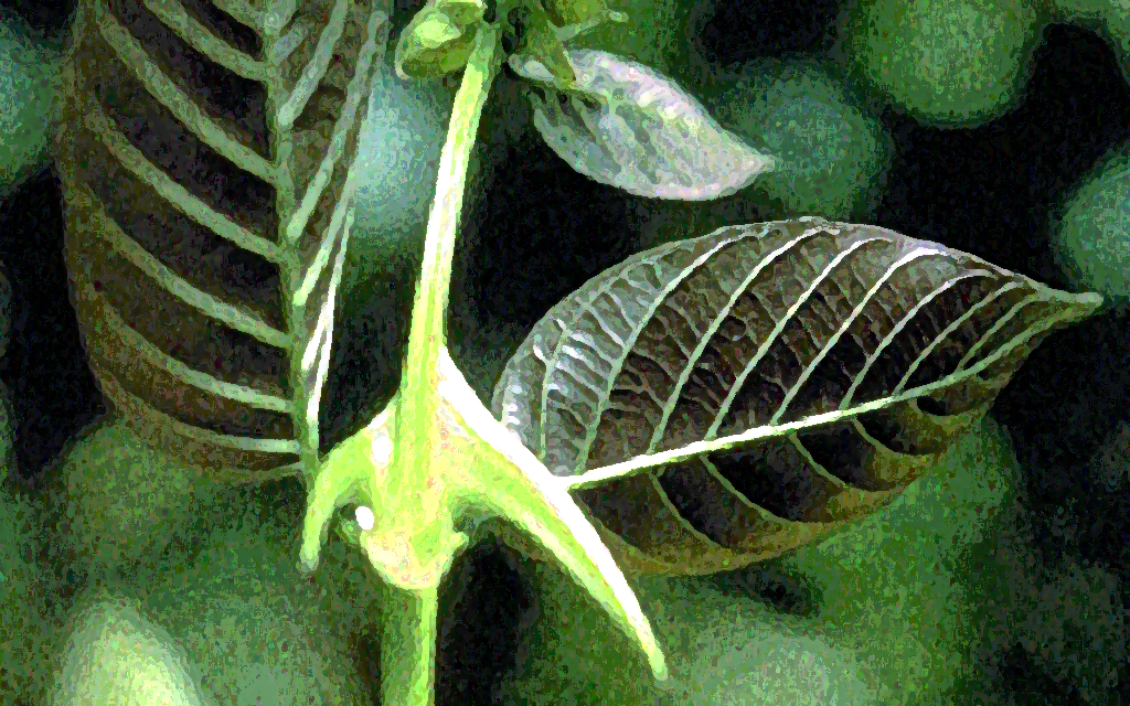 Die Dornen der Katzenkralle, Uncaria tomentosa, sind meist leicht sichelförmig gekrümmt und an der Basis der paarweise angeordneten Blätter gelegen.